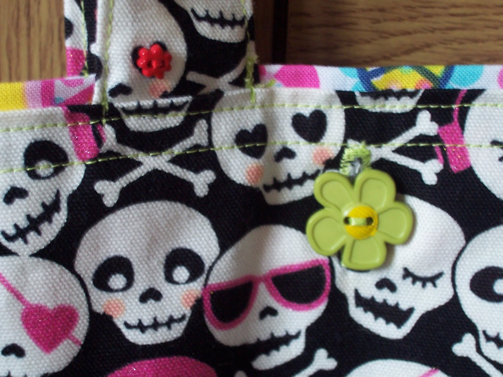 With the remaining skull fabric i made two little Rock chick bags, i added a cute little flower buttons to one of the skulls eyes on the handles and it gives it a little quirkiness, i used this black and white pinstripe fabric as a lining, and it is also fully reversible.